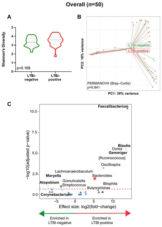 Stool from LTBI-positive people is Moryella-, Atopobium-, Corynebacterium-, and Streptococcus-depleted and Faecalibacterium-, Blautia-, Gemmiger-, and Bacteroides-enriched. (A) Comparison of Shannon’s diversity index of LTBI-positive and LTBI-negative groups. (B) Principal coordinate analysis of Bray–Curtis distances between groups. (C) Volcano plot depicting differentially abundant taxa. More discriminatory taxa (bolded) appear closer to the left or right and higher above the threshold (red dotted line, FDR = 0.20). Relative abundance of taxa is indicated by circle size. The blue circles are taxa below the selected threshold. Abbreviation: LTBI: latent TB infection.