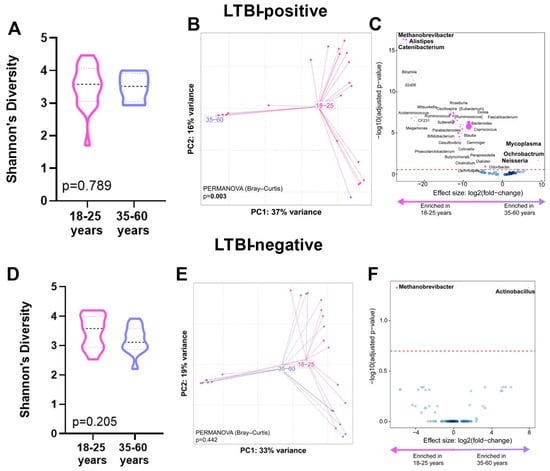 When we compared age groups within people of the same LTBI status, within LTBI-positive individuals, no α-diversity differences occurred (p = 0.789, Figure 3A); however, the β-diversity differed (p = 0.003, Figure 3B). Older LTBI-positive people were Ochorobactrum-, Neisseria-, and Mycoplasma-enriched and Catenibacterium-, Alistipes-, and Methanobrevibacter-depleted (Figure 3C). LTBI-negative individuals did not differ in α-diversity (p = 0.205, Figure 3D) or β-diversity (p = 0.442, Figure 3E), and older LTBI-negative people were also Methanobrevibacter-depleted and Actinobacillus-enriched. (Figure 3F). We calculated the Bray–Curtis distances for older vs. younger LTBI-positive and LTBI-negative people. Both age groups demonstrated similar distances (p = 0.952) across LTBI statuses (Supplementary Figure S2).