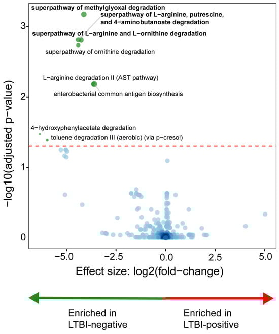 Distinct microbial metabolic pathways are associated with LTBI. LTBI-positive people had a depletion of degradation-associated pathways. More discriminatory pathways (bolded) appear closer to the left or right and higher above the threshold (red dotted line, FDR = 0.20). The blue circles are pathways below the selected threshold. Abbreviation: LTBI: latent TB infection.