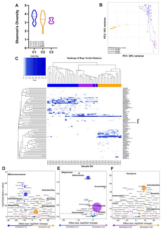 Taxonomic analyses: Three clusters (C1, C2, and C3) were identified (Supplementary Figure S3) with C1 vs. C2 (p = 0.361) and C2 vs. C3 (p = 0.299) having similar α-diversity whilst C1 vs. C3 differed (p = 0.040) (Figure 5A). The β-diversity differed between clusters (PERMANOVA p = 0.001) (Figure 5B). C1, C2, and C3 were characterised by high Bacteriodes, Streptococcus, and Prevotella abundances, respectively (Figure 5C). When cluster pairs were compared (Figure 5D–F), C1 was, compared to C2, Methanobrevibacter-, Catenibacterium-, and Megamonas-enriched and Actinobacillus-, Moraxella-, and Ochrobactrum-depleted and, compared to C3, Megamonas-, Akkermansia-, and Anaerostipes-enriched and Succinivibrio-, Prevotella-, and Dialister-depleted. C3 was, compared to C2, Roseburia-, Anaerovibrio-, and CF231-enriched and Actinobacillus-, Moraxella-, and Ochrobactrum-depleted. When all three clusters were compared together (Supplementary Figure S4), C1 was, relative to the others, the most enriched in Bacteroides, Oscillospirai, and Parabacteroides. C2 was the most enriched in Streptococcus, Veillonella, and Actinomyces, and C3 was the most enriched in Prevotella and Catenibacterium.
