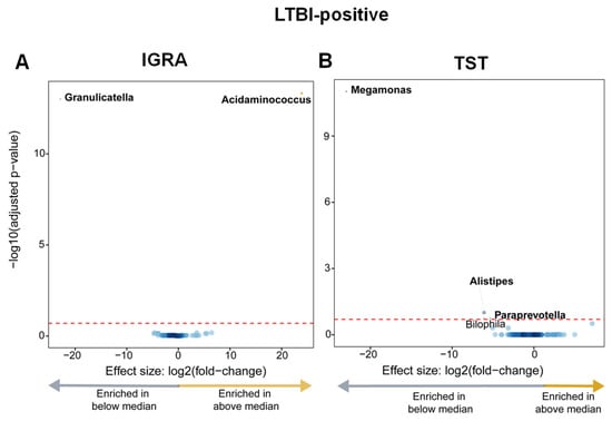 LTBI-positive people had, based on the magnitude of the quantitative responses, differentially enriched taxa (those with IGRA responses above the median were Acidaminococcus-enriched and Granulicatella-depleted; those with TST responses below the median were Megamonas-, Alistipes-, and Paraprevotella-enriched). (A) Volcano plot depicting differentially abundant taxa based on the median IGRA quantitative response to antigen (median value 5.56). More discriminatory taxa appear closer to the left or right and higher above the threshold (red dotted line, FDR = 0.20). The blue circles are pathways below the selected threshold. (B) Volcano plot depicting differentially abundant taxa based on the median TST response (median value: 18). Abbreviation: LTBI: latent TB infection.