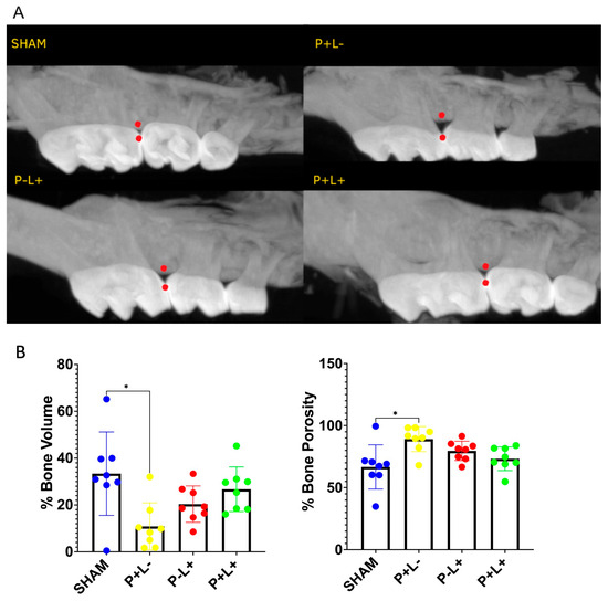 The oral inoculation with the microbial consortium resulted in significant alveolar bone loss as evidenced by decreased bone volume and increased porosity in the P+L- group compared to SHAM (Figure 1). This deleterious effect was attenuated by the treatment with probiotics. While pathogen-inoculated groups presented mean 10.8% (±10.0) bone volume and mean 89.13% (±10.02) porosity in the measured ROI, treatment with L. acidophilus LA-5 elevated bone volume to mean 26.7% (±9.52) and decreased bone porosity to mean 73.27% (±9.52). L. acidophilus administration (P-L+) per se resulted in minimal and insignificant bone loss.