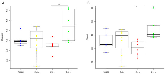 Phylogenetic alpha diversity indices (Chao in (A), and Shannon in (B)) of the oral microbial communities of C57Bl/6 mice submitted to different treatments: SHAM (negative control), P+L- (positive control, inoculated with the microbial consortium), P-L+ (L. acidophilus LA5), P+L+ (microbial consortium + L. acidophilus LA5). Kruskal–Wallis with Dunn’s test, significant differences * p < 0.05, ** p < 0.01.