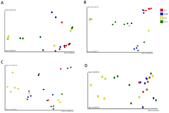 Principal Coordinates Analyses (PCoA) based on Bray–Curtis (A), Jaccard (B), unweighted (C) and weighted (D) Unifrac distances of gut microbial communities of C57Bl/6 mice submitted to different treatments: SHAM (negative control), P+L- (positive control, inoculated with the microbial consortium), P-L+ (L. acidophilus LA5), P+L+ (microbial consortium + L. acidophilus LA5). Each dot represents one sample.
