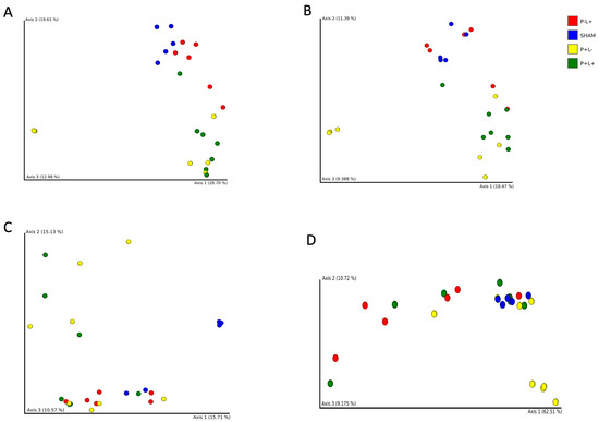 Administration of the microbial consortium (P+L-) and/or the probiotic (P-L+ and P+L+) did not alter the alpha diversity indexes of oral and gut niches when these groups were compared to the SHAM (P-L-) group. However, the richness and evenness (Chao1 and Shannon diversity indexes, respectively) of the oral microbiome were higher under pathogen infection and probiotic co-treatment (P+L+) than for the P-L+ group (Figure 2A,B). This suggests that the administration of the probiotic in mice infected with the microbial consortium leads to increased diversity in the oral cavity when compared to the administration of the probiotic alone in healthy animals. Alpha diversity indexes did not differ when the gut microbiomes of the four studied groups were compared (Supplemental Figure S1).