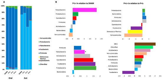 Phyla relative abundance (%)-based plots (in A) and fold changes of abundance (in B) of oral and gut microbial communities of C57Bl/6 mice submitted to different treatments: SHAM (negative control), P+L- (positive control, inoculated with the microbial consortium), P-L+ (L. acidophilus LA5), P+L+ (microbial consortium + L. acidophilus LA5). The effect of L. acidophilus LA5 in the oral biofilm and gut microbiomes was determined by comparing the abundance of taxons in the P-L+ group and SHAM, and in the P+L+ group and P+L-. * ANCOM, significant differences.