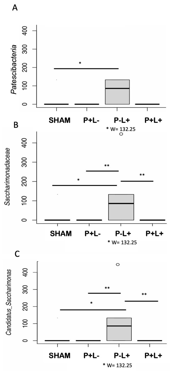 The composition of the gut microbiome differed among the groups regarding the phylum Patescibacteria (in A), the family Saccharimonadaceae (in B), and the genus Candidatus Saccharimonas (in C) in C57Bl/6 mice submitted to different treatments: SHAM (negative control), P+L- (positive control, inoculated with the microbial consortium), P-L+ (L. acidophilus LA5), P+L+ (microbial consortium + L. acidophilus LA5). ANCOM revealed differences in microbial mean taxa abundance among the groups. W values for the P-L+ group are shown using the 75th percentile of the W distribution as the empirical cut-off value. Kruskal–Wallis with Dunn’s pos hoc test. Significant differences * p < 0.05; ** p < 0.01.