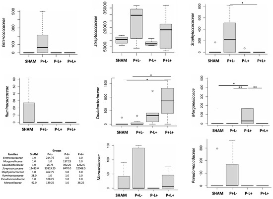 Differences in taxa abundance in the oral microbiome were not seen at high taxonomic levels, but the abundance of several taxa at the family level differed among groups (Figure 7). ANCOM analysis indicated that administration of the microbial consortium increased the abundance of Enterococcaceae, Streptococcaceae, Staphylococcaceae, Moraxellaceae, Pseudomonadaceae, and Caulobacteriaceae in the oral microbiome, as attested when the P+L- group was compared to SHAM. On the other hand, the administration of L. acidophilus LA5 (P-L+) led to the increased abundance of Caulobacteriaceae and Morganellaceae and the decreased abundance of Moraxellaceae when compared to SHAM. All three experimental groups showed reduced abundance of Ruminococcaceae when compared to SHAM. More importantly, the administration of L. acidophilus LA5 to the animals infected with the microbial consortium (P+L+) abolished most of the differences in the oral microbiome promoted by the microbial consortium by decreasing the abundance of Enterococcaceae, Pseudomonadaceae, Moraxellaceae, Staphylococcacea, and Streptococcaceae, reaching abundance levels similar to those demonstrated in the SHAM group. However, the levels of Caulobacteriaceae continued to increase with the co-administration of L. acidophilus LA5 to the infected group (Figure 7 and Figure S4). The gut microbiome of P-L+ mice differed from the other groups due to an increased abundance of the family Saccharimonadaceae, genus Saccharimonas (Figure 6B,C), although other differences could be observed at the family level when data were converted to fold changes (Figure S4).
