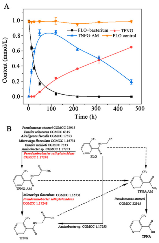 Nitrile-converting bacteria typically possess nitrilase and NHase/amidase systems. Previous studies revealed that Alcaligenes faecalis CGMCC 17553 has a bifunctional nitrilase (named NitA) that transformed FLO into both TFNG and TFNG-AM (Figure 2B). However, no nitrilase gene was identified in the genome of P. salicylatoxidans CGMCC 1.17248 or M. flocculans CGMCC 1.16731. As a result, amidases are probably involved in the formation of TFNG by these bacteria. M. flocculans CGMCC 1.16731 and V. boronicumulans CGMCC 4969 could further metabolize the FLO intermediate TFNG-AM to TFNG [18,20]. As a result of these findings, a complete metabolic pathway for FLO degradation can be proposed for P. salicylatoxidans CGMCC 1.17248.