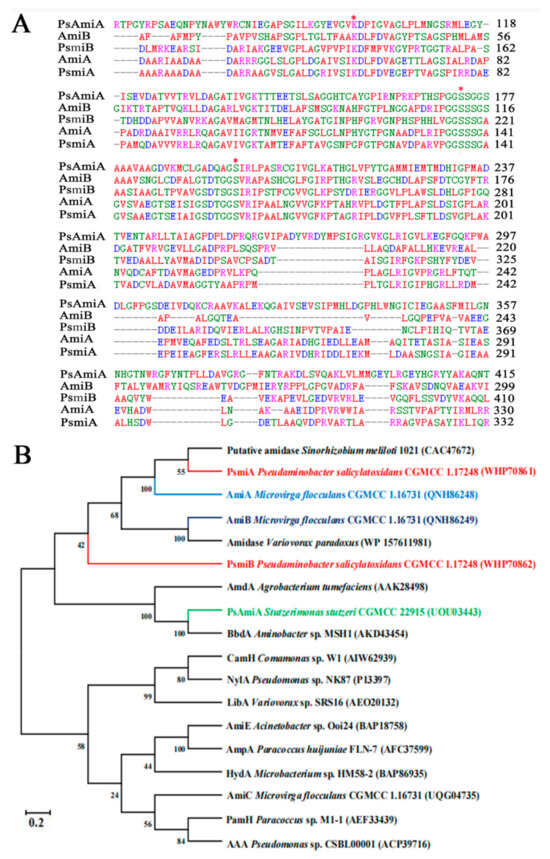 Alignment of partial amino acid sequences of PsmiA and PsmiB and phylogenetic analysis. (A) Red asterisks indicate residues belonging to the Ser–Ser–Lys catalytic triad. (B) Phylogenetic tree showing the relationships between PsmiA, PsmiB, and other amidases from signature family amidases, constructed using the neighbor-joining method. Bootstrap percentages are shown at the nodes from 1000 replicates.