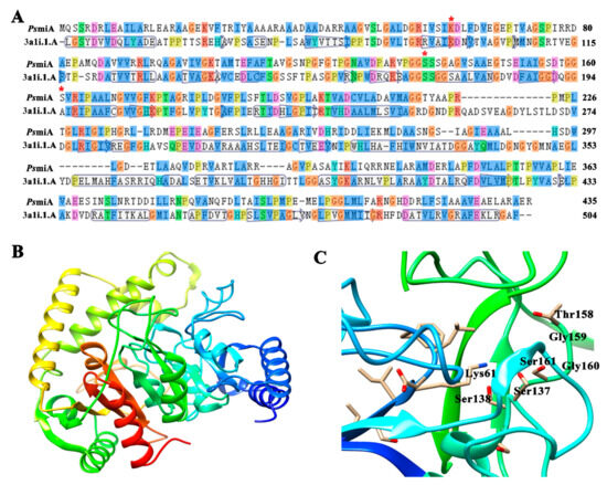 Homology modeling of PsmiA. (A) Sequence alignment of PsmiA and the selected amidase template, and analysis of key residues. (B) Homology model of the three-dimensional structure of PsmiA. (C) The predicted structure of PsmiA contains the Ser161–Ser137–Lys61 catalytic motif and other important active site residues. * indicated the amino acid residues of the catalytic triad.