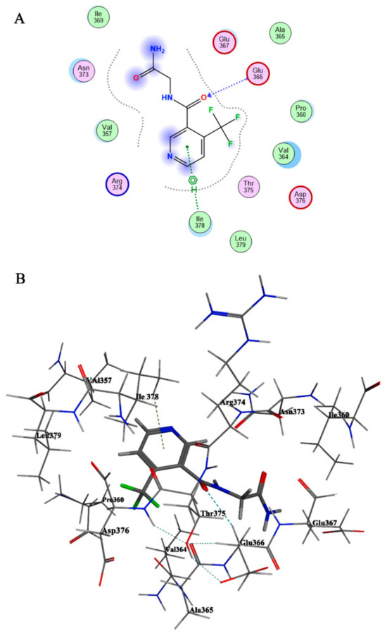 Calculations from molecular docking experiments of the structural model TFNG-AM of PsmiA with ligand TFNG-AM are shown in Table S1. The list has been ordered by how well the ligand binds, with the docking score and the “S” column serving as the primary reference criteria: a lower value indicates that the ligand is more strongly bound to the receptor. Compound TFNG-AM exhibited the highest binding affinity and RMSD (value 3.3902 Å) to PsmiA, as summarized in Table S1. The S value for it was −5.0515, and it strongly interacted with the binding site by forming two H-bonds, with residues Glu247 and Met242 (Figure 6A). In the catalytic pocket, the pyridine ring and trifluoromethyl group of TFNG-AM formed hydrophobic interactions with hydrophobic amino acids Leu239, Pro244, Pro356, and Ile378 (Figure 6A). These hydrophobic interactions stabilized the conformation of TFNG-AM in the catalytic pocket and ensured the nucleophilic attack of Ser161 on TFNG-AM. Based on the different interaction modes of the ligand with the hydrophilic amino acid backbone in the PsmiA binding site (Figure 6B), we postulate that the hydrophilic fragments in residues Glu243, Glu247, Arg240, and Asp241 play important roles in the binding of molecules to PsmiA.