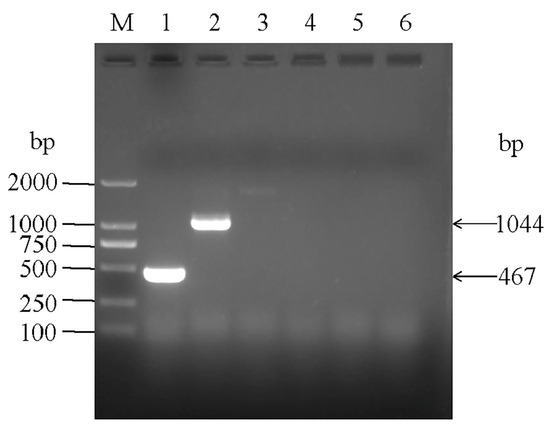 The results of agarose gel electrophoresis showed that the P. multocida-specific primer KMT1 was used to amplify a bright band of 467 bp in size, which was consistent with the expected size of P. multocida, indicating that the strain was P. multocida and was named P. multocida SHZ01. Five capsular serotype primers were used to identify the serotype of the strain. The results showed that the hyaD-hyaC primers amplified a bright band of 1044 bp, which was consistent with the size of serotype A P. multocida, indicating that the strain was serotype A P. multocida (Figure 1). P. multocida could be detected in four argali hybrid sheep infected with Mo (Figure S1A).