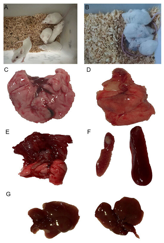 Depicts the pathological changes observed in mice following challenge with the P. multocida serogroup A isolate, namely, P. multocida SHZ01. (A) represents mice in the control group, while (B) illustrates mice in the experimental group. (C) displays the lung morphology of mice in the control group, showcasing a normal appearance. In contrast, (D,E) show the lungs of mice in the experimental group, revealing congestion, edema, and pulmonary adhesions. Furthermore, (F,G) illustrate the spleen and liver, respectively, in both the control and experimental groups. (F) demonstrates the spleen in the control group, while (G) showcases the enlarged spleen and liver, with small white spots on the surface, in the experimental group. These pathological findings provide visual insights into the impact of P. multocida SHZ01 infection on the respiratory and systemic organs of the experimental mice.