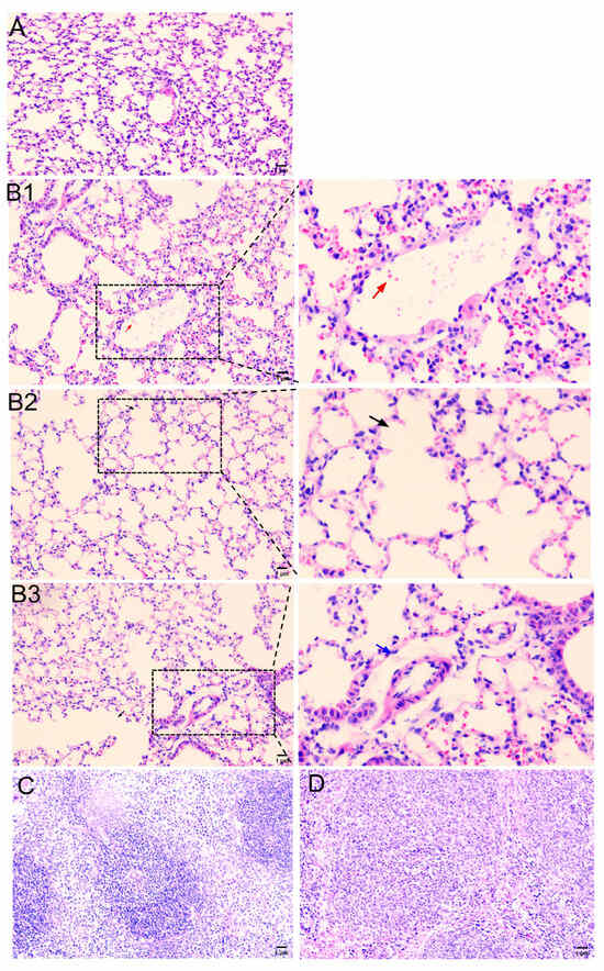 Presents histopathological observations (200×) of mice challenged with the P. multocida serogroup A isolate, P. multocida SHZ01. (A) illustrates the lungs of healthy mice, providing a baseline for normal lung histology. In contrast, (B1–B3) depict the lungs of mice infected with P. multocida SHZ01, revealing distinct histopathological changes. Specifically, (B1) highlights an intra-alveolar hemorrhage (red arrow), (B2) showcases the enlarged alveolar septa (black arrow), and (B3) indicates the presence of fibrinous exudation (blue arrow). (C) provides a reference by showing the spleen of healthy mice, demonstrating normal histological features. In contrast, (D) displays the spleen of mice infected with P. multocida SHZ01, revealing notable histopathological changes. These histopathological findings offer a detailed insight into the lung and spleen damage inflicted by the P. multocida SHZ01 strain, emphasizing the impact on the pulmonary microarchitecture. These histopathological observations contribute to a comprehensive understanding of the systemic effects of the bacterial challenge on the immune organ.