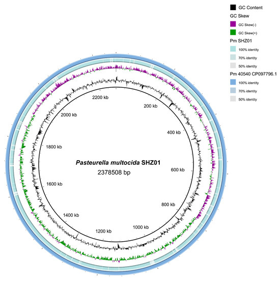 The P. multocida SHZ01 strain underwent comprehensive whole genome sequencing using the advanced Illumina NovaSeq PE150 sequencing platform. The sequencing effort resulted in the assembly of 63 contigs, with the longest contig reaching a length of 173,201 base pairs. Post-assembly analysis revealed a GC content of 40.17%, while the GC content specifically associated with coding genes was determined to be 40.89%. A comparative circular genome (BLAST) visualization of the genomes of strains SHZ01 and 40540 (using the strain 40540 as a reference) is shown in Figure 4. The complete gene sequence of the P. multocida SHZ01 strain spans a substantial length of 2,378,508 base pairs, encompassing a total of 2418 coding genes (Table 1). To facilitate broader access to the genomic information, the entire dataset for the strain has been deposited in the National Center for Biotechnology Information (NCBI) under the unique accession number JAWWTW01000000. These sequencing and assembly details provide a foundational resource for further genomic and functional analyses of the P. multocida SHZ01 strain.