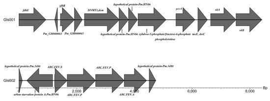 Gene islands (GIs) are characterized by segments of the genome integrated through lateral gene transfer. Accessory genes clustered as a GI are desirable for the pathogenesis and adaptation of the bacteria in the host [26]. The genome of P. multocida SHZ01 strain was predicted to contain two GIs. P. multocida HN07 [27] of pig and P. multocida HN02 of sheep contain nine GIs and five GIs, respectively. Two GIs were harbored in the P. multocida SHZ01 strain, GIs001 and GIs002, as depicted in Figure 5. Moreover, the GIs001 contained two virulence-associated genes, sitA and sitB, which are related to the iron transport system. The GIs002 contained three iron transport system-associated genes: ABC.FEV.S, ABC.FEV.P, and ABC.FEV.A.