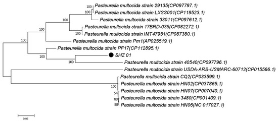 From the whole genome sequencing results of the P. multocida SHZ01 strain, conserved gene sequences, including two 16S rRNA, three 23S rRNA, and three 50S rRNA, were selected. A BLAST algorithm of the National Center for Biotechnology Information (NCBI) platform was used for genetic sequence analysis. Fourteen distinct strains were chosen for further analysis, and the evolutionary relationships among these strains were determined by constructing an evolutionary tree using the Neighbor-Joining method implemented in MEGA 7.0.26 software.