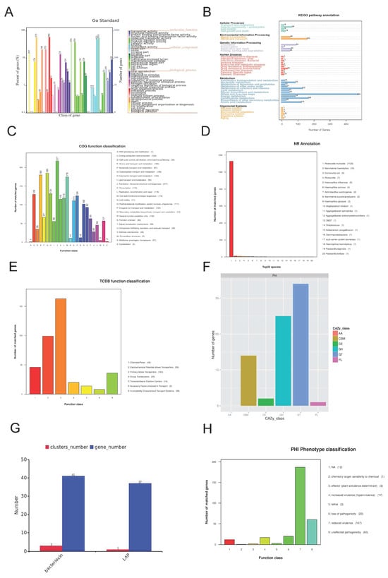 Provides comprehensive insights into the functional annotation of P. multocida SHZ01. (A) GO Functional Classification Diagram: This diagram illustrates genes’ Gene Ontology (GO) functional classification. The horizontal axis depicts the GO functional categories, the right vertical axis indicates the number of genes annotated for each category, and the left vertical axis represents the percentage of genes in each category relative to all coding genes. (B) KEGG Metabolic Pathway Classification Diagram: The bar chart displays the classification of genes into different metabolic pathways according to the Kyoto Encyclopedia of Genes and Genomes (KEGG). Numbers on the bars denote the count of genes annotated for each pathway. The other coordinate axis provides the code for each level 1 functional class in the KEGG database. (C) COG Functional Classification Diagram: This diagram represents the functional classification of genes based on the Clusters of Orthologous Groups (COG) database. The horizontal axis indicates COG functional types, and the vertical axis shows the number of genes annotated for each type. (D) NR Functional Classification Diagram: In this diagram, the horizontal axis represents species ID, and the vertical axis indicates the number of genes annotated for each species in the Non-Redundant Protein Database (NR). (E) TCDB Function Classification Diagram: The horizontal axis represents the TCDB primary classification type, and the vertical axis represents the number of genes on the annotation. (F) CAZy Functional Classification and Corresponding Gene Quantity Statistical Chart: The horizontal axis represents the classification type of the CAZy database, from left to right—Auxiliary Activities (AAs); cCarbohydrate-Related Modules (CBMs); Carbohydrate Esterases (CEs); Glycoside Hydrolases (GHs); Glycosyl Transferases (GTs); Polysaccharide Lyases (PLs). The vertical axis represents the number of genes annotated. (G) Statistical Diagram of Gene Clusters and Corresponding Gene Numbers: The horizontal axis represents Gene cluster name, and the vertical axis represents the number of genes contained in gene clusters. (H) Distribution Map of Pathogen PHI Phenotypic Mutation Types: The horizontal axis represents the type of phenotype mutation, and the vertical axis represents the number of genes on the annotation.
