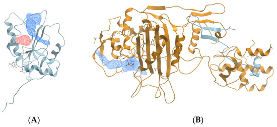 In this work, an approach was developed to assess the druggability of proteins by analyzing their binding pocket structures in L. monocytogenes. A protein is considered druggable if a drug molecule can bind to one of its binding pockets and impact its typical function [21]. Molsoft ICM-Pro software (Sorrento Valley, CA, USA) is one of the best platforms for identifying pockets that ligands can dock to and measuring their structural features, which can impact the likelihood of ligand docking [22]. For example, a binding pocket must be accessible to a ligand, and the pocket must be large enough to accommodate the ligand. Protein structures used for analysis in ICM-Pro are obtained from the Protein Data Bank (PDB). Figure 1 shows examples of the analysis of ICM-Pro on protein structures with pockets without (Figure 1A) and with docked ligands (Figure 1B).
