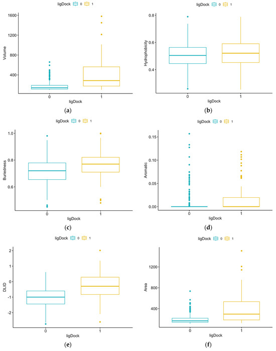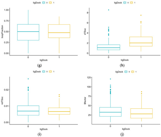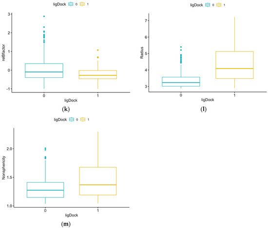 Comparison of results for each structural feature for pockets with and without ligands: (a) volume, p-value = 2.2 × 10−16 (Mann–Whitney); (b) hydrophobicity, p-value = 0.0417 (t-test); (c) buriedness, p-value = 1.734 × 10−7 (t-test); (d) aromatic, p-value = 1.309 × 10−12 (Mann–Whitney); (e) DLID, p-value = 2.2 × 10−16 (t-test); (f) area, p-value = 2.2 × 10−16 (Mann–Whitney); (g) loopFraction, p-value = 0.6116 (Mann–Whitney); (h) dTSsc, p-value = 2.2 × 10−16 (Mann–Whitney); (i) relTSsc, p-value = 0.5352 (Mann–Whitney); (j) Bfactor, p-value = 0.001695 (Mann–Whitney); (k) relBfactor, p-value = 1.906 × 10−5 (Mann–Whitney); (l) radius, p-value = 2.2 × 10−16 (Mann–Whitney); (m) nonsphericity, p-value = 8 × 10−7 (Mann–Whitney).