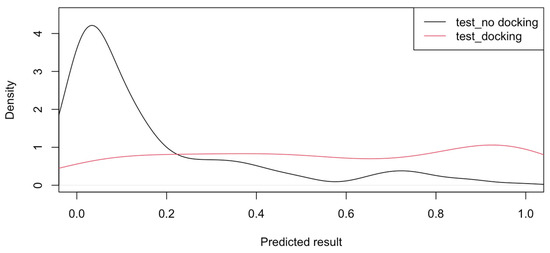 The LR model was tested by using it to predict the results for pockets for the reference testing data. Figure 4 shows the density plot for model predictions for the test data. The predicted results for pockets without a ligand are clustered near zero, as expected. However, the predicted results for pockets with ligands are spread out across a wider range of values. This indicates that the pocket characteristics are more consistent, and the model can more accurately identify pockets with no ligands.