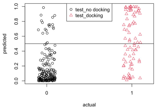 The classification of predicted results for the test data is shown graphically in Figure 5, referred to as the confusion matrix. With a cutoff value of 0.5, the overall prediction accuracy for the model evaluating the testing data set was 80%. For actual values of 0, i.e., “no docking”, 91% of the values were correctly predicted, i.e., below the horizontal line at y = 0.5. For actual values of 1, i.e., “docking”, 55% of the values were correctly predicted, i.e., above the horizontal line at y = 0.5.