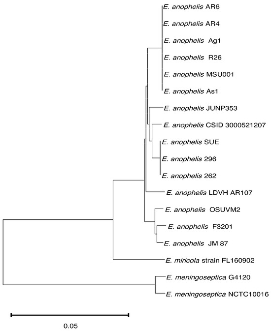 Phylogenetic placement of E. anophelis MSU001. The tree was constructed with 18 genomes with a core of 2307 genes per genome, 41,526 in total. The core had 783,693 amino acid residues/bp per genome, 14,106,474 in total. The horizontal bar represents 0.05 substitutions per site.