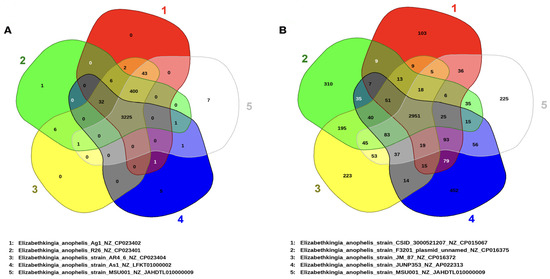 Venn diagram illustrating the distribution of shared and specific clusters of orthologous groups in the selected Elizabethkingia genomes. (A) Venn diagram of shared and unique genes in the selected mosquito-associated Elizabethkiniga. (B) Venn diagram of shared and unique genes in MSU001 and the clinically important Elizabethkiniga. The unique and shared genomes among the compared genomes were determined using the BLAST score ratio approach of EDGAR 3.2 with a cutoff of 30%.