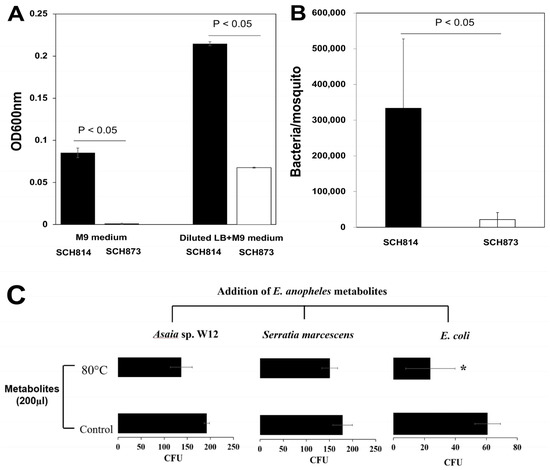 Inhibitory effects of Elizabethkingia metabolites on selected bacteria. * Statistically significant difference (p < 0.05). (A) Growth comparison between wild type strain for arginine utilization (SCH814) and arginine metabolism mutant (SCH873) in the M9 medium and M9 medium supplemented with 20-fold diluted LB medium. (B) Comparison between growth of SCH814 and SCH873 in mosquitoes. (C) The effects of spent media on the growth of Asaia sp. W12, Serratia marcescens and E. coli. The spent broth from E. anophelis MSU001 (48-h incubation) was added E. coli, Serratia marcescens ano1 and Asaia sp. W12, statically cultured at 28 °C for 24 h and plated on their respective solid agar media for CFU calculation.