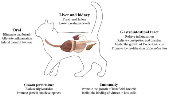 Probiotics are host-friendly active microorganisms, thus safe, nontoxic, devoid of residue accumulation, non-polluting, and incapable of developing drug resistance. Probiotics may be ingested in food or feed additives, and then improve the intestinal microecological balance, enhance immunity, and ensure healthy pet growth (Figure 1). Probiotics are becoming promising alternatives to antibiotics when seeking to optimize animal production. However, their effects on cats are often inferred from reports on dogs or humans. Cat research remains preliminary. Here, we review the current state of research on how probiotics affect cat health, facilitating the further development and application of probiotics for cats.