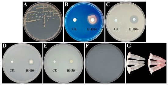 Plant growth promotion of strain BHJ04: (A) Colony morphology. (B) Siderophore production. (C) Potassium solubilization. (D) Organic phosphate solubilization. (E) Inorganic phosphate solubilization. (F) Nitrogen fixation. (G) Indole acetic acid production. LB is the control group.