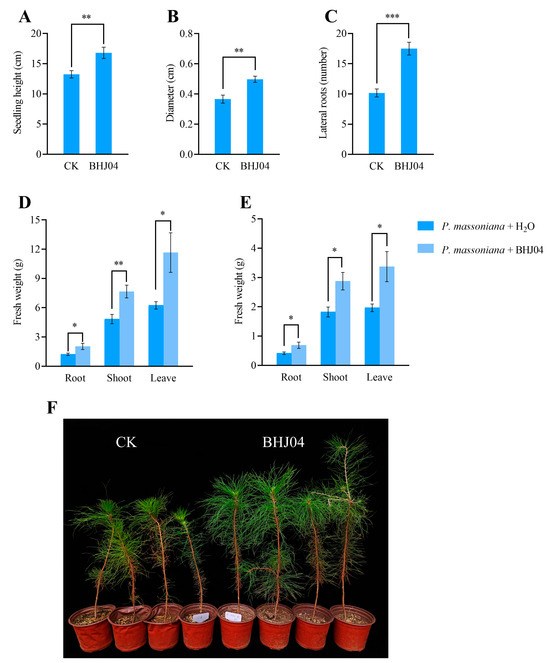 Growth promotion of P. massoniana seedlings by the BHJ04 bacterial suspension. (A) Seedling height. (B) Diameter. (C) Lateral roots. (D) Fresh weight. (E) Dry weight. (F) P. massoniana seedlings. LB medium was used as a control. Asterisks indicate significant differences according to Duncan’s multiple range test. “*” denotes p ≤ 0.05, “**” denotes p ≤ 0.01, “***” denotes p ≤ 0.001.