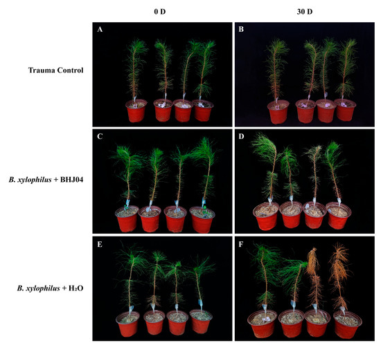 (A,B) Trauma control. Two-year-old P. massoniana plants were inoculated with a (C,D) BHJ04 bacterial suspension, inoculated with pine nematodes, or (E,F) inoculated with pine nematodes. Symptoms were relatively reduced in the BHJ04 bacterium suspension treatment group compared to the nematode inoculation group.