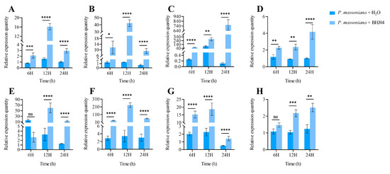 Plant cytochrome P450 family genes are essential in cellular detoxification mechanisms and are key components in the biosynthesis and evolution of metabolites with diverse biological activities in plants [37]. We investigated the changes in the expression of cytochrome P450 (Figure 4H) and its monooxygenase genes (Figure 4G) in treated and control P. massoniana trees. Compared with the control, inoculation with strain BHJ04 significantly enhanced the expression of cytochrome P450 and cytochrome P450 monooxygenase superfamily genes in infected P. massoniana. The expression of the gene encoding cytochrome P450 monooxygenase was downregulated at 24 h compared to 12 h after inoculation with the PWN. Nevertheless, the expression of the gene encoding cytochrome P450 gradually increased over time.