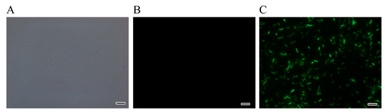 Morphology of strain BHJ04 observed under 100× LSCM. (A) Wild-type strain BHJ04. (B) EGFP-labelled strain BHJ04 in the dark field. (C) EGFP-labelled strain BHJ04. Scale: 10 μm.