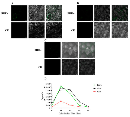 Detection of the fluorescent strain EGFP-BHJ04 colonization. (A) Colonization of strain EGFP-BHJ04 on pine leaves. (B) Colonization of strain EGFP-BHJ04 on pine stems. (C) Colonization of strain EGFP-BHJ04 on pine roots. From left to right. The first images were EGFP fluorescence-field bright-field images, the second images were bright-field images, and the third image was a combination of the first two images. Scale: 10 μm. (D) Colonization dynamics of P. massoniana strain BHJ04 inoculated for 0 d, 15 d, 30 d, 45 d, and 60 d as detected using RT-qPCR.