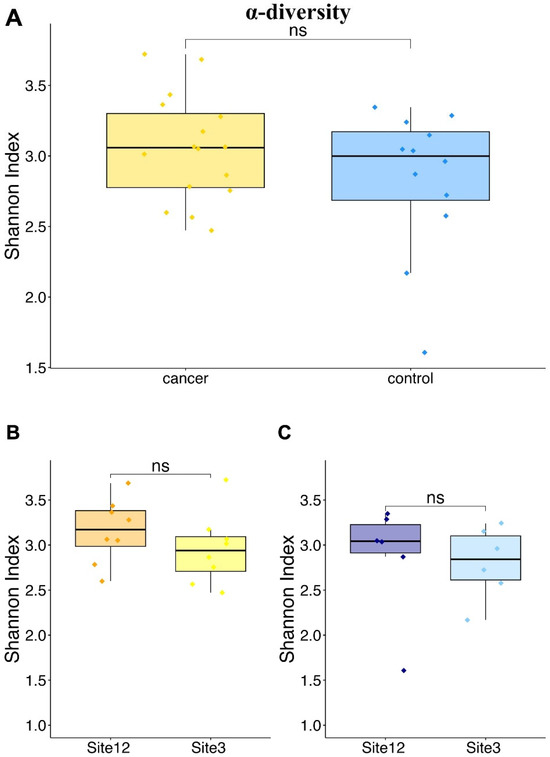 Shannon index α-diversity values. (A) Shannon index values for control and cancer cases; (B) Shannon index values for sites 12 and 3 in cancer cases; and (C) Shannon index values for sites 12 and 3 in control cases (ns, not statistically significant).