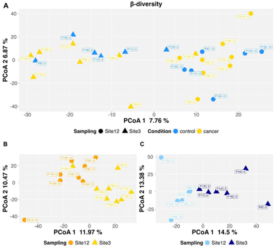To evaluate the inter-sample diversity between the different conditions (control vs. cancer; site 3 vs. site 12), β-diversity analysis was performed. Considering both components, no separation was observed between the control and cancer group samples (7.76% for PCoA1; 6.87% for PCoA2) (Figure 2A). However, based on the first component, within the same group (control or cancer), the samples clustered separately according to the endometrial region (sites 3 and 12) (Figure 2B,C).
