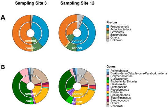 At the phylum level (Figure 3A), Proteobacteria and Actinobacteria were the most abundant phyla in both the control and cancer groups, followed by Firmicutes and Bacteriota. Considering the sampling sites, Proteobacteria were more abundant at site 12 (50% in control cases and 42% in cancer cases) with respect to site 3 (37% in control cases and 36% in cancer cases). Meanwhile, Actinobacteria were more present at site 3 (49% in control cases and 50% in cancer cases) than at site 12 (27% in control cases and 36% in cancer cases). The phylum Firmicutes was less abundant, present at the same percentage (9%) at sites 3 and 12 in both conditions.