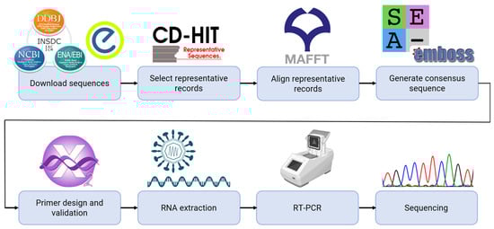 Schematic of the methodology used to design primers for each dengue virus (DENV) serotype. All available genomic RNA sequences of DENV were downloaded from the International Nucleotide Sequence Database Collaboration. Subsequently, 100–200 representative records for each serotype were selected using CD-HIT-EST (v4.8.1). These records were then aligned using MAFFT (v7.515), and the aligned sequences were further analysed using SeaView (v5.0.5) and EMBOSS (v6.6.0) to generate a consensus sequence for each serotype. To amplify the complete E gene of each serotype, the terminal region of the prM gene and the beginning of the NS1 gene were analysed to design the primers. The primers were designed using Primer3 (v2.6.1) and subjected to validation using AmplifX2 (v2.1.1). Following the same procedure, primers spanning the entire E gene were designed for each serotype for the Sanger sequencing. The DENV envelope gene was amplified through an RT-PCR assay, followed by Sanger sequencing using our newly designed primers.