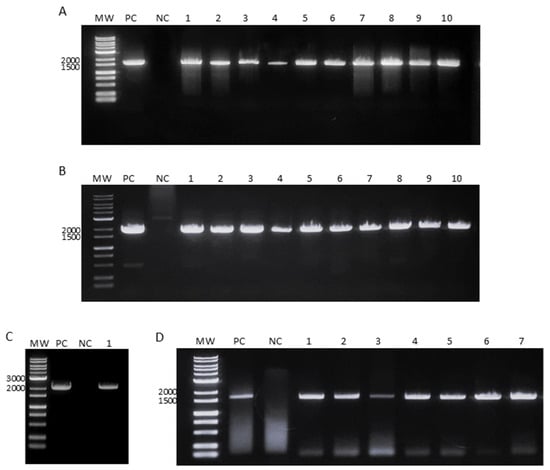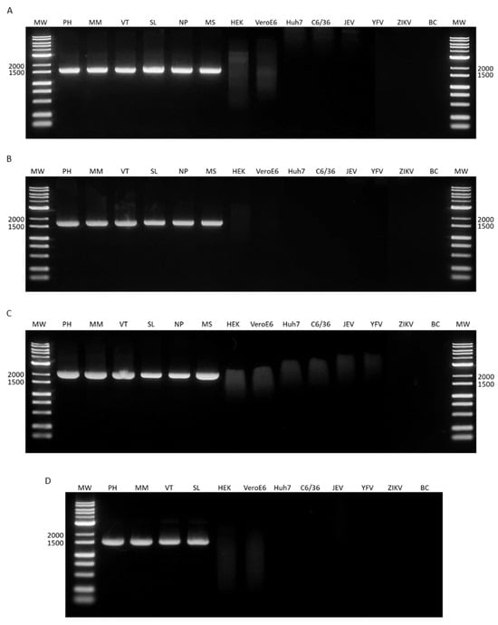 Specificity of primers when amplifying the full-length envelope gene of DENV isolates from the Philippines, Myanmar, Vietnam, Sri Lanka, Nepal, and Malaysia. The expected band sizes after amplification were (A) 1740 bp for the DENV-1 primer set, (B) 1859 bp for DENV-2, (C) 2335 bp for DENV-3, and (D) 1747 bp for DENV-4. MW, molecular weight marker; PH, the Philippines; MM, Myanmar; VT, Vietnam; SL, Sri Lanka; NP, Nepal; MS, Malaysia; HEK, HEK-293T cells; VeroE6, Vero E6 cells; Huh7, Huh7 cells; C6/36, C6/36 cells; JEV, Japanese encephalitis virus; YFV, yellow fever virus; ZIKV, Zika virus; and BC, blank control (water).