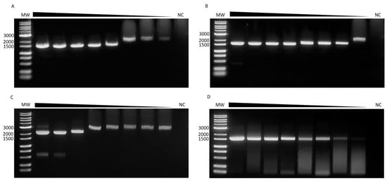 The detection limit of our primer sets was determined through 10-fold serial dilutions of cDNA from isolated viruses, with an initial concentration of 1 × 108 DNA copies/μL. Our primers detected all the prepared dilutions, including those with the lowest concentrations (Figure 4). Notably, larger bands were observed at different DENV-1, DENV-2, and DENV-3 dilutions. However, it was possible to sequence the entire E gene after purifying the DNA from these bands and sequencing.