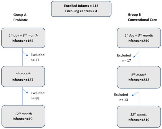 Following the important screening carried out in the hospitals involved in this study, initial consent to participate in the study was progressively given to 500 parental couples or single parents, representing as many newborns as needed for the study that were candidates to be born by cesarean section. However, in numerous cases, more frequently in the participants belonging to the group that would have been treated with the probiotic, consent was withdrawn shortly before the start of the treatment. The justification most often given was the fear that a commitment to 6 months of daily treatment would perhaps be too demanding. In a smaller number of cases, and for many varied reasons, some babies who were expected to be born by cesarean section were delivered naturally; these infants were then excluded from this study. For these reasons, the number of infants enrolled in this study was 413. The sample comprised 230 males and 183 females. Group A, the treatment arm, was composed of 164 infants, and group B, the control arm, was composed of 249 infants. Due to the progressive exclusion process employed during the trial, 268 infants (49 in the probiotic group and 219 in the control group) completed this study. The progressive reduction trend in the number of infants per group during this study is shown in Figure 1. Reasons for progressive exclusion are reported in Supplementary Table S1. Infants’ demographics and clinical features are summarized in Table 1. Gestational age, birth weight, feeding type, and milk formulas were not significantly different in the two groups. The different milk formulas adopted at the enrolment are listed in Supplementary Table S2. No difference was found regarding maternal age, weight, parity, and swab positivity for S. agalactiae (Supplementary Table S3). Children’s features, including birth season and possible pathological events occurring or measured in the first 72 h, were not significantly different between the two groups (Supplementary Table S4).