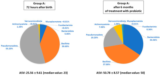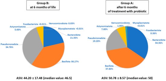Graphic representations at phylum level of gut microbiota of infants of the control group (Group B) at 6 months of life (left) and of the probiotic group (Group A) after 6 months of treatment (right). Significant differences concern the phylum Pseudomonadota (former Proteobacteria), which reduced in the probiotic group versus control. A tendential but not significant difference is also observed in the phyla Actinomycetota (former Actinobacteria) and Bacteroidota (former Bacteroidetes), and in biodiversity, both are more expressed in the group treated with the probiotic versus controls. Verrucomicrobiota, Mycoplasmatota, Fusobacteriota, and Bacillota are the new phyla names, respectively, for Verrucomicrobia, Tenericutes, Fusobacteria, and Firmicutes. ASV: amplicon sequence variant.