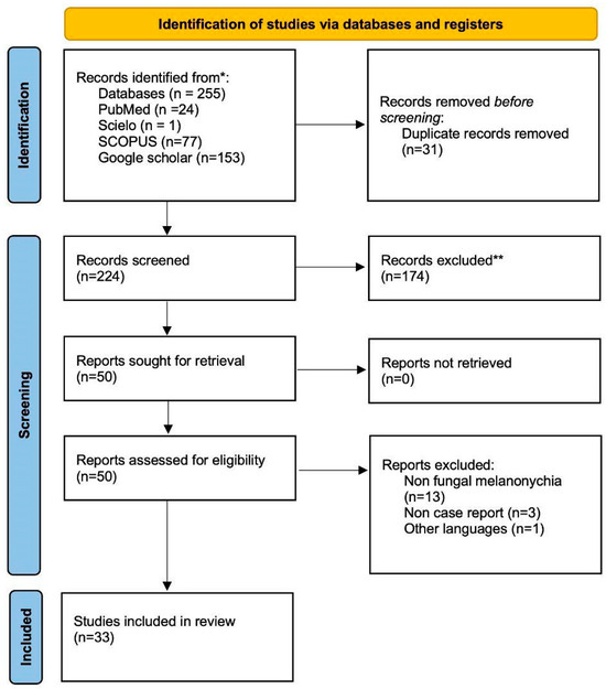 Studies that did not detail the presence of fungal melanonychia; studies where melanonychia was caused by other diseases; as well as conference posters, reviews, meta-analyses, systematic reviews or articles that did not include case reports were excluded. Two independent reviewers (P.N.C.-L. and E.G.-M) evaluated the titles, abstracts and full texts of each potential study. (E.M.-H. and R.P.-A.) resolved any details regarding study inclusion and evaluated methodological quality.