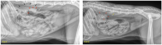 Abdominal radiographs of cats with one or more kidney stones (white arrows) (profile view of cats 1 to 9 in reading direction and front view of cat 7). Cat 2 had a ureteral stone (yellow arrow). Cat 5 had several small stones in the bladder (green arrows). Renal asymmetry can be observed in certain profile views (cats 1, 2, and 7), with the contours of the larger kidney indicated by black arrows, and the contours of the smaller kidney indicated by red arrows.