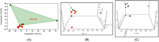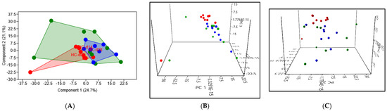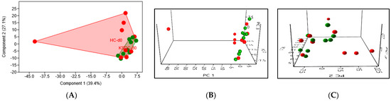 (A) 2D PCA graphic comparing, at D0, the intestinal microbiota of the two cat populations, healthy cats (HC) in red and kidney stone diseased cats (KSDC) in green. (B,C) Exploring the same previously described patterns with 3D PCA plotting.