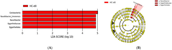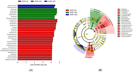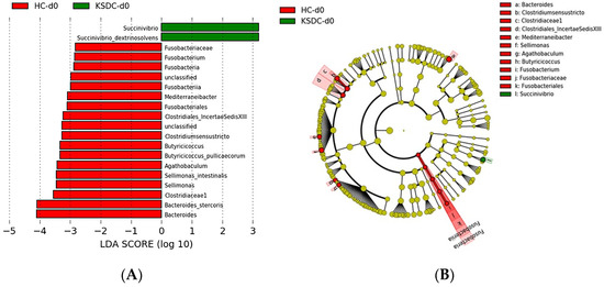 (A) Histogram of the LDA scores for differentially abundant bacterial clades in the fecal samples between healthy cats (HC) and kidney stone diseased cats (KSDC). Negative (red bars) LDA scores represent bacterial groups that are over-abundant in HC samples, while positive (green bars) represent bacterial groups that are overrepresented in the KSDC samples at day 0 (d0). LDA score also indicates the effective size and ranking of each differentially abundant taxon (LDA score > 3.0; p-value < 0.05). (B) Cladogram of phylogenetic relationships of bacterial lineages associated with healthy cats (HC) and kidney stone diseased cats (KSDC) at day 0 (d0): the taxonomic levels are represented by rings with phyla at the innermost and genera at the outermost ring, and each circle is a bacterial member within that level.
