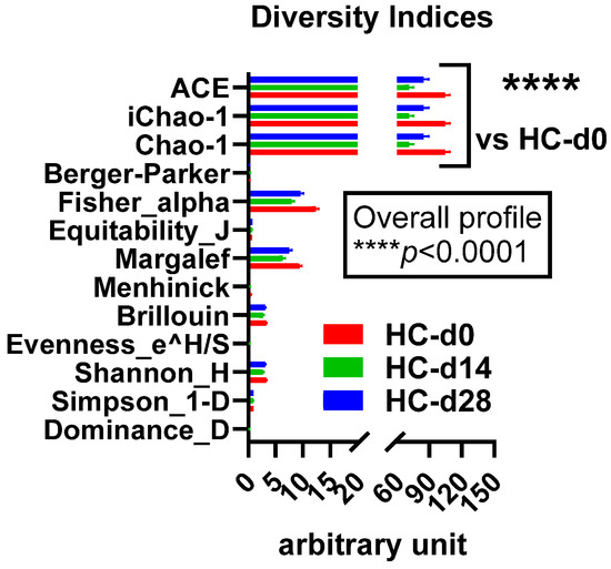 Comparison of the diversity indices among the healthy cats (HC) at day 0 (d0) (in red), day 14 (d14) (in green), and day 28 (d28) (in blue). **** p < 0.0001, 2-ANOVA followed by a two-stage linear step-up procedure of Benjamini, Krieger, and Yekutieli to correct for multiple comparisons by controlling the False Discovery Rate (<0.05).